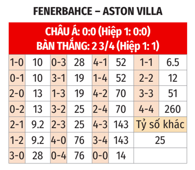Với những lợi thế nhất định về phong độ, thành tích sân nhà và đặc biệt là sân nhà, nhiều khả năng Fenerbahce sẽ thắng theo châu Á khi đón tiếp Aston Villa. Hơn nữa, hai đội cùng ghi bàn và có nhiều bàn thắng cũng là những kịch bản dễ xảy ra nhất ở trận này.