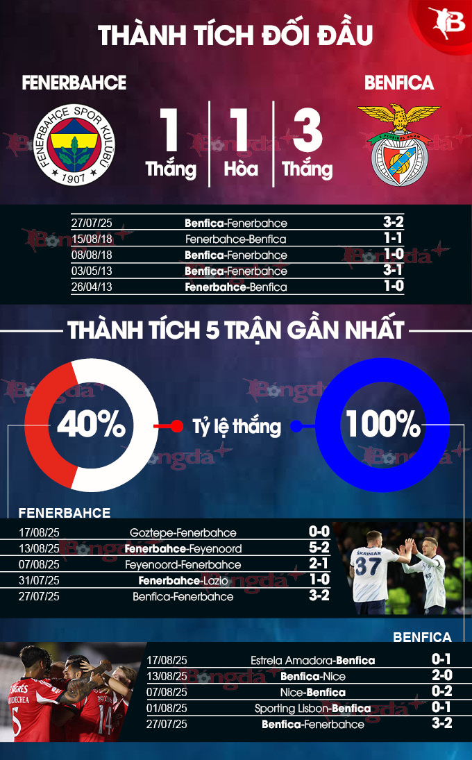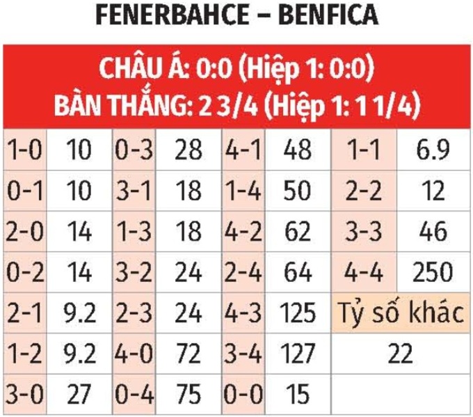 - X hiệp 1: 3/4 trận đấu mới nhất của Fenerbahce chỉ xuất hiện nhiều nhất 1 bàn thắng trong hiệp đầu. 6/8 trận đấu gần đây của Benfica cũng chỉ có tối đa 1 bàn thắng trong hiệp 1.
