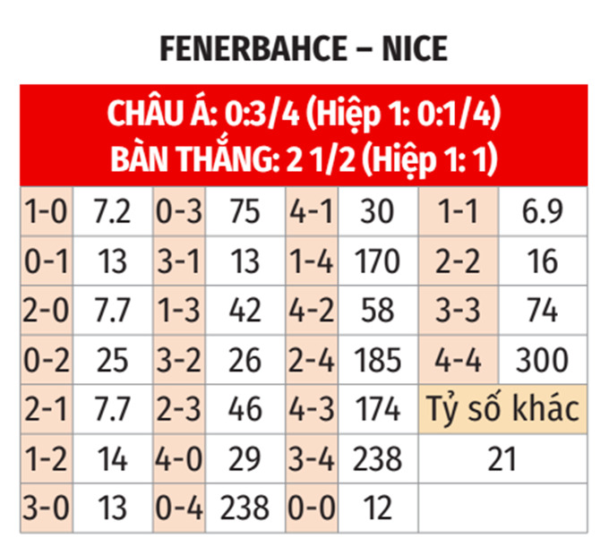 - Fenerbahce thắng theo châu Á: Fenerbahce thắng 5/7 trận gần nhất ở sân nhà trên mọi đấu trường. Còn Nice thua 7, hòa 1, thắng 1 ở 9 trận gần đây; thua 5, hòa 1, thắng 1 ở 7 chuyến xa nhà vừa qua. Do đó, những người yêu mến Fenerbahce có thể tin tưởng ở họ trận này.