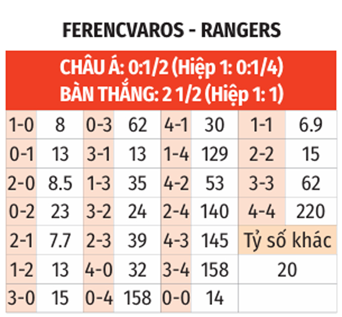 Ferencvaros có lợi thế sân nhà và thắng 4/5 trận vừa qua nhưng Rangers không sợ đá sân khách khi không thua ở 5 trận vừa xong (tính trong 90 phút). Có khả năng, màn so T sắp tới sẽ kết thúc với tỷ số hòa.