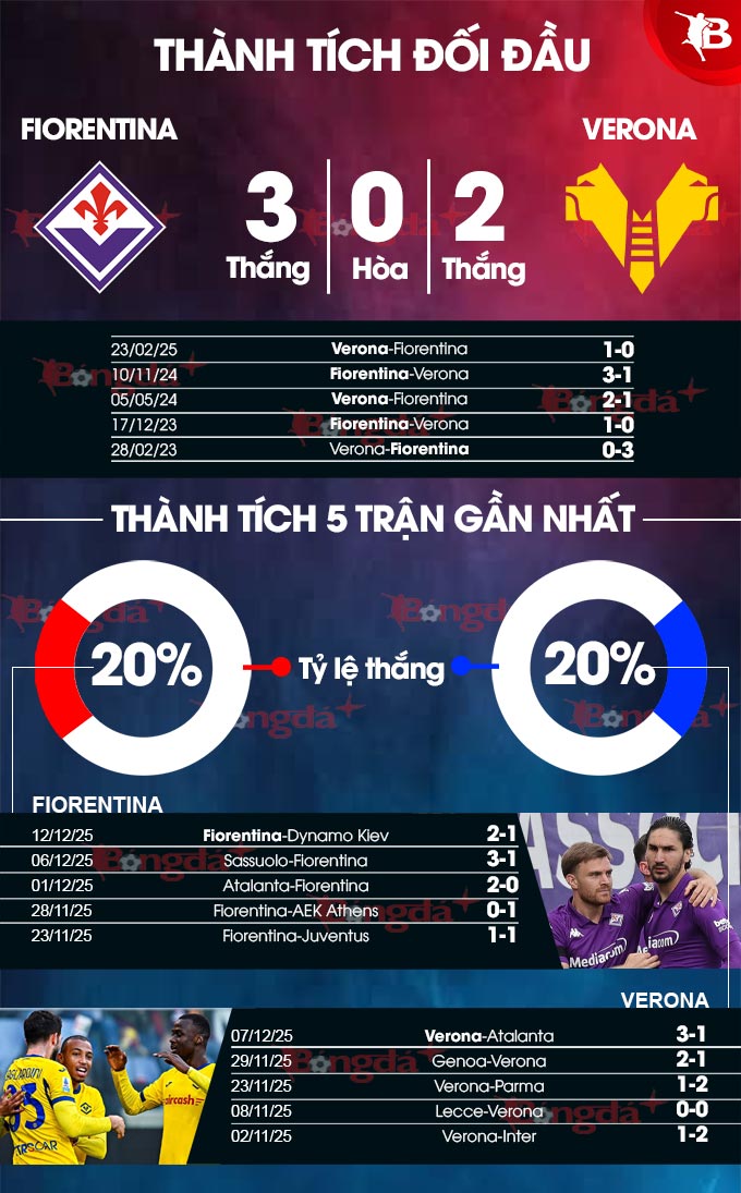Cơ hội tìm kiếm chiến thắng đầu tiên tại Serie A mùa này của Fiorentina đến ở màn so T với Hellas Verona, một trận chung kết ngược đúng nghĩa giữa hai đội đang đứng bét bảng. Ba năm liên tiếp, Verona đều phải vật lộn trụ hạng, nhưng họ luôn tránh được việc xuống hạng Serie B. Mùa giải 2025/26 cũng sẽ rất khó khăn, khi họ đang kém khu vực an toàn 4 điểm.