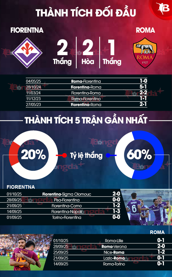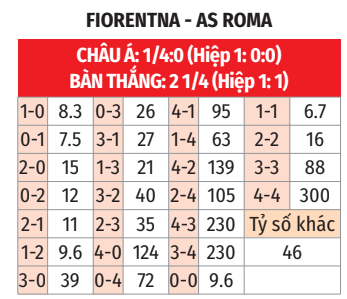 - Nhiều bàn thắng: Cả 3 trận sân khách gần đây khi Roma nhường đối phương 0 đến 1/4 bàn thắng đều có tối thiểu 3 bàn. Cả 4 trận Serie A vừa qua trên sân nhà của Fiorentina và 6/7 lần gần nhất họ tiếp đón Roma trên sân Artemio Franchi đều khép lại với 3 lần lưới rung trở lên.