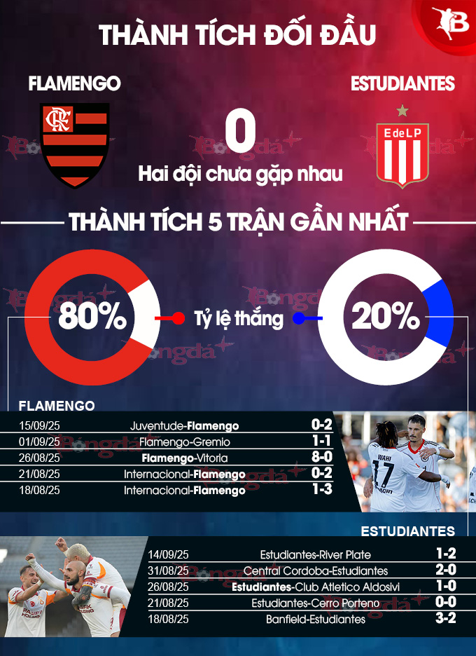 - T hiệp 1: 8/9 trận gần nhất của Flamengo và 4/5 trận vừa qua của Estudiantes đều có ít nhất 1 bàn trong hiệp 1. Hơn nữa, 3/4 trận sân nhà gần đây của Flamengo và 6/9 chuyến làm khách vừa qua của Estudiantes cũng đều chứng kiến ít nhất 1 lần lưới rung hiệp 1.