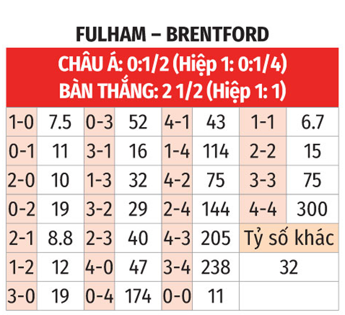 Chưa hết, Fulham có thành tích đối đầu tốt trước Brentford khi thắng 3, hòa 1 và thua 1 ở 5 trận vừa xong. Có khả năng, đội khách sẽ ra về tay trắng.