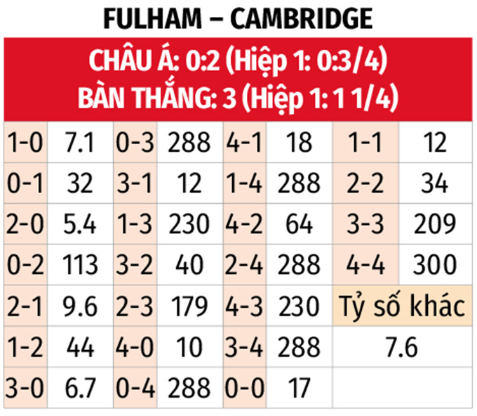 - Fulham thắng theo châu Á: Các cầu thủ Fulham đang có thành tích ấn tượng với việc thắng theo châu Á 7/8 trận gần nhất. Trước một Cambridge United thua kém rất nhiều về đẳng cấp, đội chủ nhà đủ khả năng mang niềm vui cho người hâm mộ.