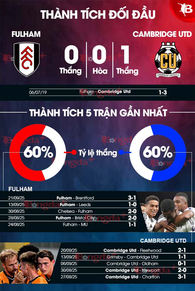 - Tối đa 3 bàn thắng: 6/7 trận gần đây của Fulham đều có tối đa 3 bàn thắng được ghi. Với Cambridge United, 8/9 trận vừa qua của đội khách có nhiều nhất 3 tình huống làm bàn.