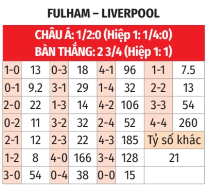 - Lẻ bàn thắng: 8/9 trận đấu gần đây của Fulham kết thúc với tổng số bàn thắng là số lẻ. 8/10 trận sân khách vừa qua của Liverpool lẻ bàn thắng.