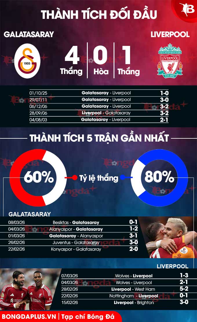 - Hai đội cùng ghi bàn: 4/5 trận đối đầu chính thức gần nhất và cả 3 trận gần đây của Liverpool đều có ít nhất 1 bàn thắng cho mỗi đội. Ngoài ra, 6/7 trận sân nhà gần đây của Galatasaray cũng khép lại mà không đội nào giữ sạch lưới nhà. Trong khi đó, Liverpool luôn ghi bàn ở cả 6 chuyến làm khách gần đây.