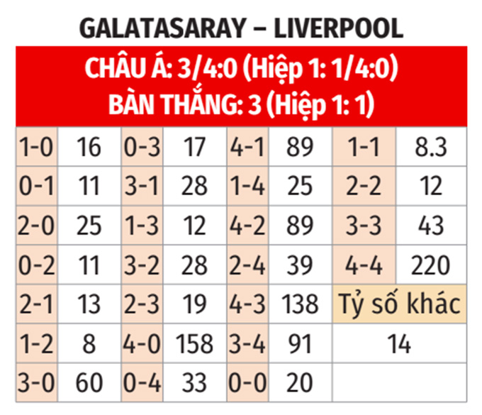 - Lẻ bàn thắng: Cả 5 cuộc chạm trán gần nhất, 3/4 trận vừa qua của Galatasaray và 7/8 trận gần đây của Liverpool đều có tổng bàn thắng là lẻ. Ngoài ra, 5/6 chuyến làm khách vừa qua của Liverpool cũng khép lại với tổng bàn thắng không chia hết cho 2.