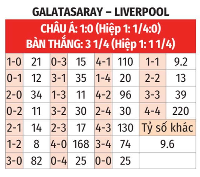 - Tối thiểu 4 bàn: 6/8 trận gần đây của Liverpool đều có tối thiểu 4 bàn. 4/6 trận vừa qua của Galatasaray cũng diễn ra theo kịch bản tương tự.