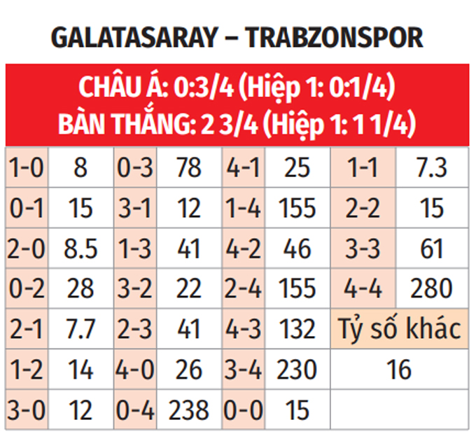 - Lẻ bàn thắng: 9/10 trận gần nhất của Galatasaray có tổng bàn thắng không chia hết cho 2. Ngoài ra, 7/8 trận vừa xong của Trabzonspor chứng kiến điều tương tự.