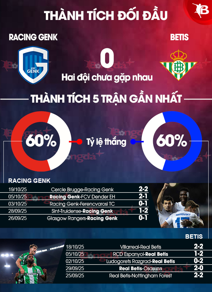 Ở chiều ngược lại, trong 6 trận sân nhà gần đây Genk chỉ thắng được có 2, còn lại là 4 lần họ để cho các vị khách được ra về với niềm vui chiến thắng. Với những gì đang thể hiện thì Genk xứng đáng được xem là "miếng mồi ngon", chứ không phải là thử thách dành cho Betis. Xét về phong độ, đại diện tới từ Tây Ban Nha với chuỗi 7 trận bất bại liên tiếp (thắng 4, hòa 3) rõ ràng đang làm tốt hơn Genk rất nhiều.