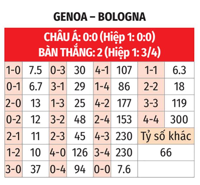 - Ít nhất 9 phạt góc: 3/4 trận gần đây của Genoa đều có tối thiểu 9 quả phạt góc. 4/6 trận gần nhất giữa đội bóng này và Bologna số phạt góc còn không dưới 10.