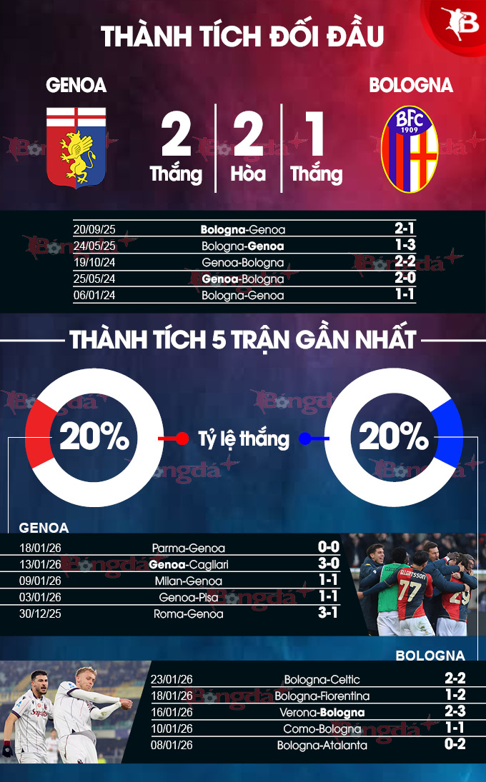 Xét về thành tích đối đầu, Bologna cũng không bằng được Genoa, do họ chỉ thắng 2 mà thua những 5 trong 10 cuộc chạm trán gần nhất giữa 2 đội. Đã vậy, họ còn phải thi đấu trên sân khách nên cơ hội để Genoa giành thêm 1 chiến thắng nữa xem ra khá sáng sủa.