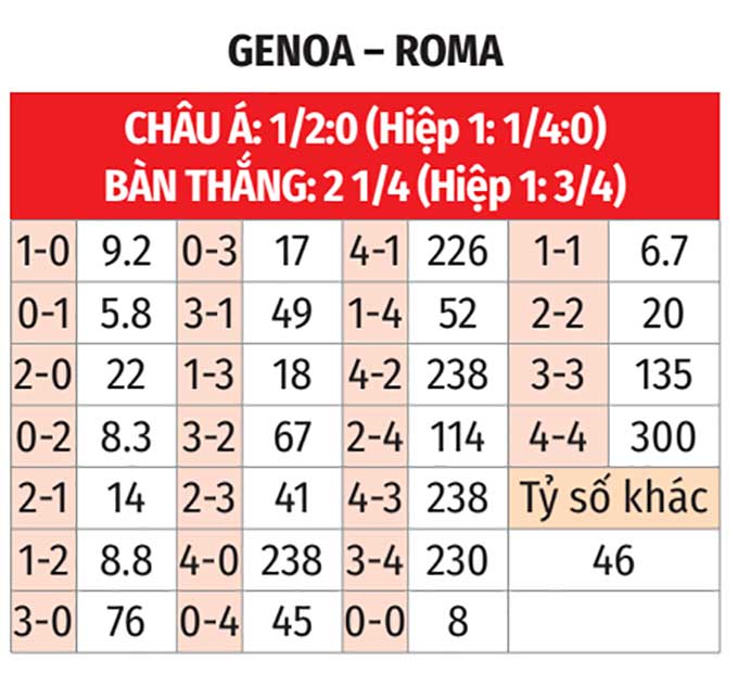 - Tỷ số chẵn: 3 trận gần đây giữa Genoa và Roma đều kết thúc với tỷ số chẵn. 3/4 trận vừa qua của Roma cũng có số bàn thắng chia hết được cho 2.