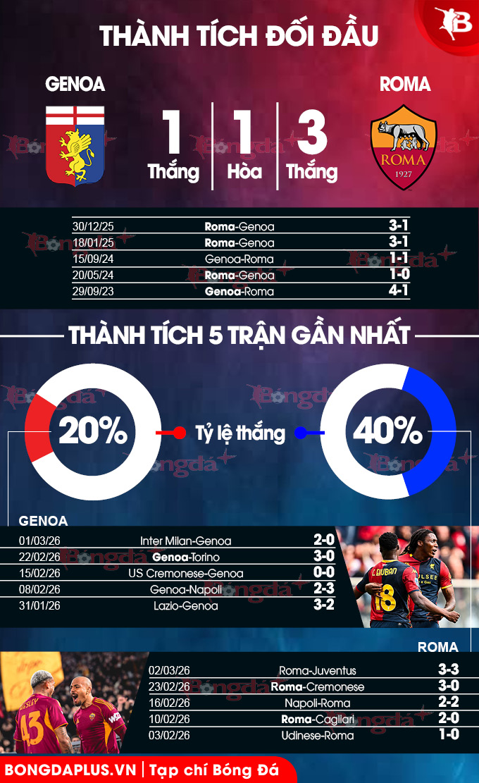 Xét về thành tích đối đầu, Genoa cũng không được lịch sử ủng hộ do họ chỉ thắng Roma 1 lần trong 21 lần gần nhất 2 bên đọ sức ở Serie A. Tuy nhiên, có một chi tiết tích cực là Genoa đã kiếm được 4 điểm trong 2 lần tiếp đón Roma gần đây. Đó có thể xem là điểm tựa để đội chủ nhà hướng tới ít nhất một kết quả hòa ở trận đấu tới.