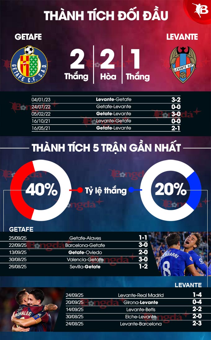- Tổng bàn thắng lẻ: 5/7 trận đối đầu gần nhất giữa hai đội đều có tổng bàn thắng lẻ. 3/5 trận vừa qua của Getafe và 3/6 trận từ đầu mùa giải của Levante cũng có tổng bàn thắng là lẻ.