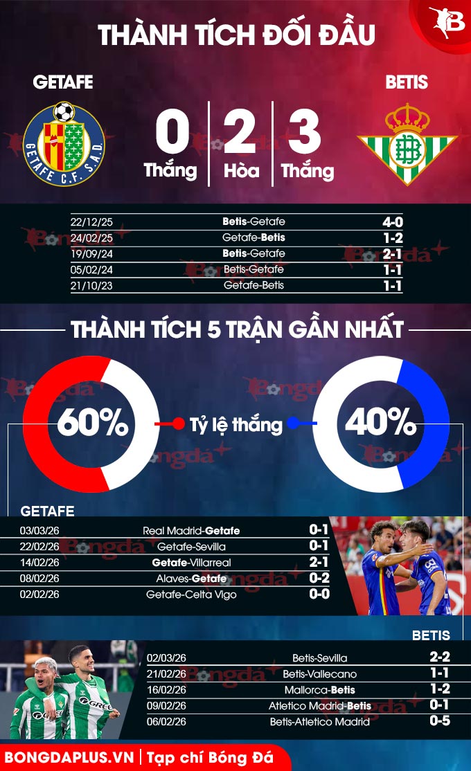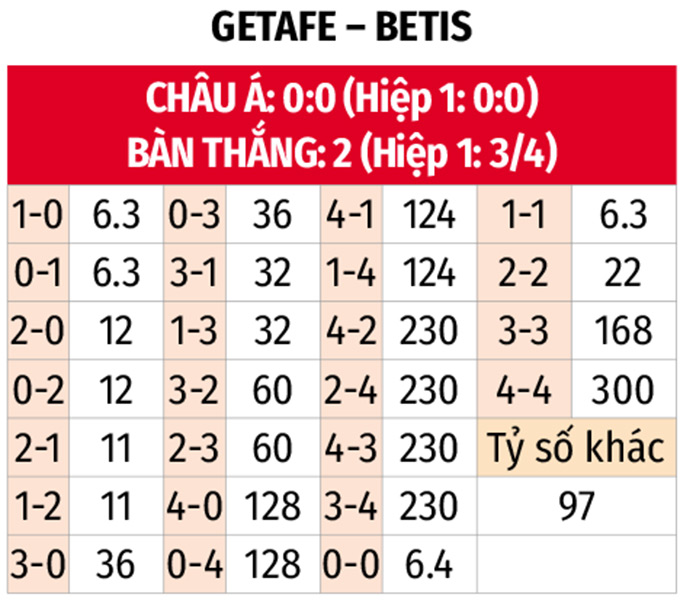 - Lẻ bàn thắng: 6/9 trận vừa qua của Getafe và 7/10 trận mới nhất của Real Betis đã khép lại với tổng bàn thắng là lẻ. Kịch bản lẻ bàn thắng cũng diễn ra ở 2/3 trận đối đầu gần nhất.