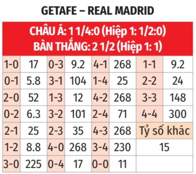 - Tối thiểu 1 bàn hiệp 1: 7/8 trận derby Madrid gần đây đều có từ 1 bàn thắng trở lên trong hiệp 1. Tình trạng tương tự xảy ra ở 6/7 trận gần đây của Getafe và 8/9 trận mới nhất của Real Madrid.