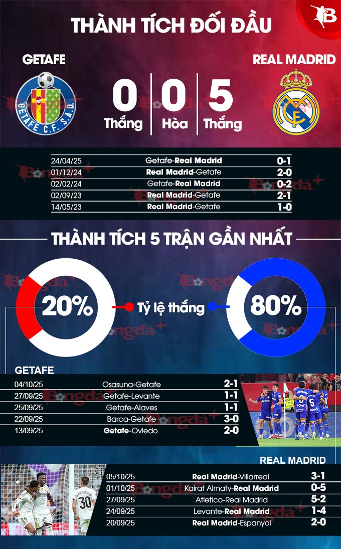 Real Madrid đang có phong độ rất ấn tượng. Họ thắng 9/10 trận đấu gần đây ở các giải đấu chính thức. Đáng chú ý, ở 4 trận đấu mới nhất, đội bóng của ông Xabi Alonso đều ghi được từ 3 bàn thắng trở lên. Đang “vào phom”, Real Madrid có lý do để tự tin sẽ đánh bại chủ nhà Getafe trong trận derby Madrid cuối tuần này.