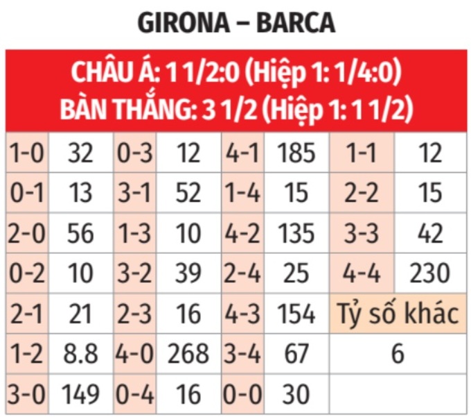 - Chẵn bàn thắng: 3/4 trận đấu gần đây của Girona kết thúc với tổng số bàn thắng là số chẵn. Tình trạng tương tự xảy ra ở 8/10 trận sân khách vừa qua của Barca.