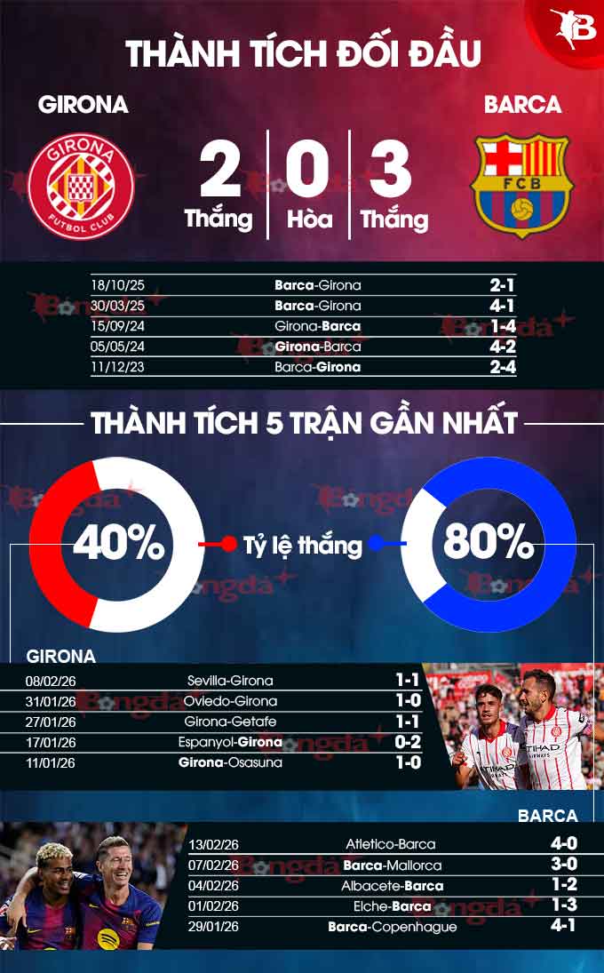Phải nhấn mạnh rằng, Barca đá sân khách cũng rất tốt. Bằng chứng là trong 6 chuyến hành quân trở lại đây, đội bóng xứ Catalunya giành tới 5 chiến thắng. Trong khi đó, Girona đá sân nhà không thực sự thuyết phục khi chỉ thắng 4/18 lần tiếp đón các đối thủ gần đây.