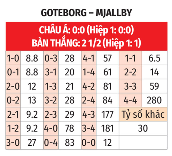 - Goteborg thua hiệp 1 theo châu Á: Goteborg đang có chuỗi 3 trận thua hiệp 1 theo châu Á. Điều ngược lại xảy ra với Mjallby ở 3/4 trận gần đây nên họ là sự lựa chọn đáng tin trước giờ nghỉ.