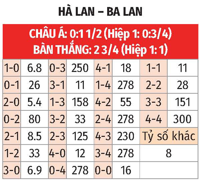 - Chẵn bàn thắng: 2/3 trận trận đối đầu gần nhất giữa 2 đội có tổng bàn thắng chia hết cho 2. Ngoài ra, 8/10 trận vừa qua của Hà Lan và 5/8 trận vừa xong của Ba Lan đều chứng kiến điều tương tự.