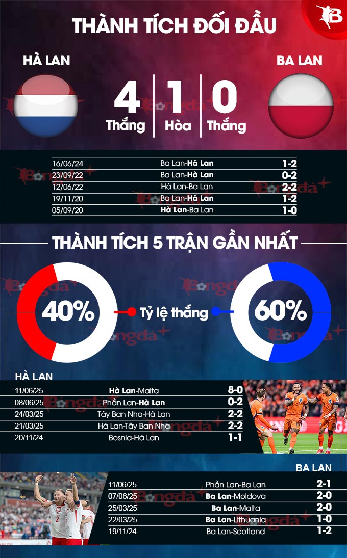 Chưa hết, Hà Lan có lợi thế sân nhà và đang có thành tích tốt tại đây với thành tích bất bại ở 4 trận gần nhất. Còn Ba Lan, họ thua 3 trận gần nhất khi làm khách.