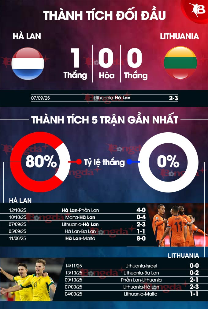 Lithuania không xứng tầm đối thủ của thầy trò ông Ronald Koeman. Họ đang có phong độ cực tệ với chuỗi 14 trận liền không biết mùi chiến thắng, gần nhất là thất bại 0-2 trước Ba Lan. Tại bảng G, họ hiện xếp ở vị trí đội sổ với thành tích chưa thẳng trận nào. Đối đầu với một đội kém cỏi như vậy, lại không còn động lực để thi đấu, Hà Lan xem ra không thắng mới là chuyện lạ.