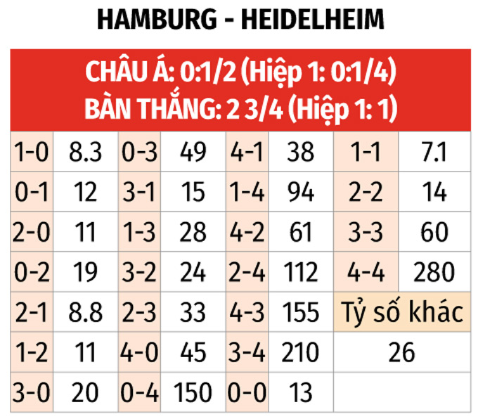 - Hamburg thua kèo hiệp 1: Trên sân nhà, Hamburg đang nhập cuộc cực tệ khi thua 5/6 trận gần đây theo cả chuyên môn và theo châu á trong hiệp 1 ở mọi đấu trường mình tham dự. Với Heidenheim, đội bóng này thắng kèo 5 trận liên tiếp gần đây trong hiệp đầu ở những chuyến làm khách.