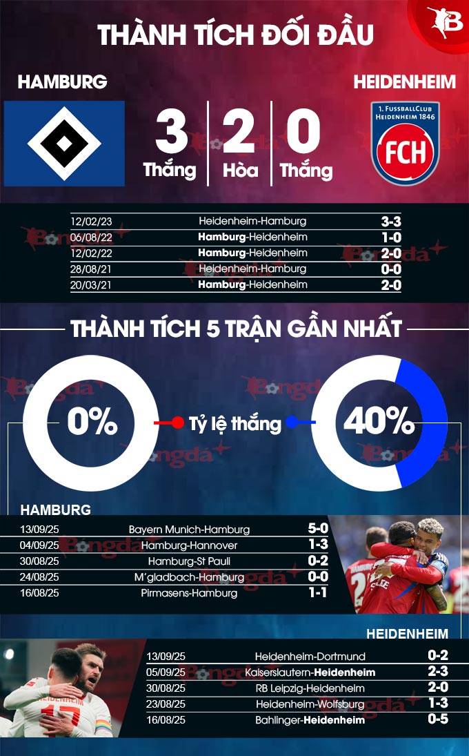 - X bàn thắng: Hàng công Hamburg chưa ghi được bàn nào sau 4 trận, trong khi các chân sút Heidenheim cũng chỉ có vỏn vẹn 1 bàn từ đầu mùa. Lịch sử đối đầu chứng kiến 4/5 trận gặp nhau gần nhất cũng có tối đa 2 bàn thắng được ghi.