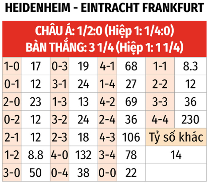 - Eintracht Frankfurt thắng theo châu Á: Eintracht Frankfurt toàn thắng theo châu Á cả 4 trận đối đầu trong quá khứ. Eintracht Frankfurt cũng đang có thành tích thắng châu Á 2 trận vừa qua, trái ngược so với 2 trận thua của chủ nhà Heidenheim.