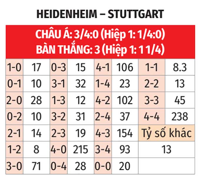 - Stuttgart thắng theo châu Á: Stuttgart thắng theo châu Á ở 4/5 trận gần nhất. Đá với Heidenheim thua theo châu Á ở 3/4 trận vừa qua, đội chủ nhà là sự lựa chọn đáng tin cậy.
