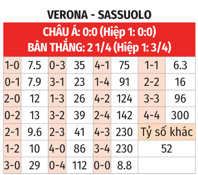 - Hai đội cùng ghi bàn: Hellas Verona đã thành công trong việc ghi bàn ở 3/4 trận gần nhất còn Sassuolo làm được điều tương tự ở 5 trận vừa qua. Bên cạnh đó, Verona cũng ghi bàn ở 3/5 trận chính thức gần nhất trên sân nhà, còn với Sassuolo là 5/6 trận chính thức vừa qua tại sân khách. Với xu hướng như vậy, khả năng cao hai đội sẽ cùng tìm được đường vào khung thành của nhau.