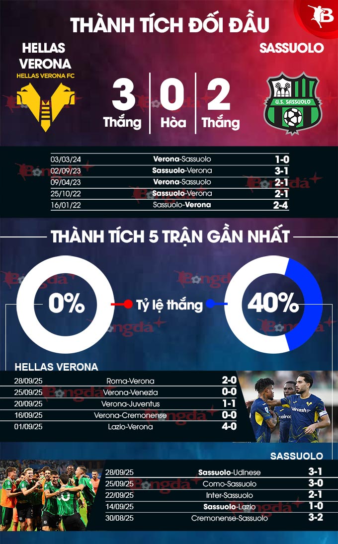 Tuy nhiên, Verona lại có lợi thế sân nhà. Điểm tựa cho Verona là 2 lần gần nhất tiếp đón Sassuolo trên sân nhà, họ đều có 3 điểm. Chưa hết, Sassuolo vẫn đối mặt với thách thức lớn: lần cuối cùng họ giành chiến thắng trên sân khách tại Serie A đã cách đây gần hai năm, từ tháng 11/2023. Do đó có khả năng, Verona lại có niềm vui ở trận này.