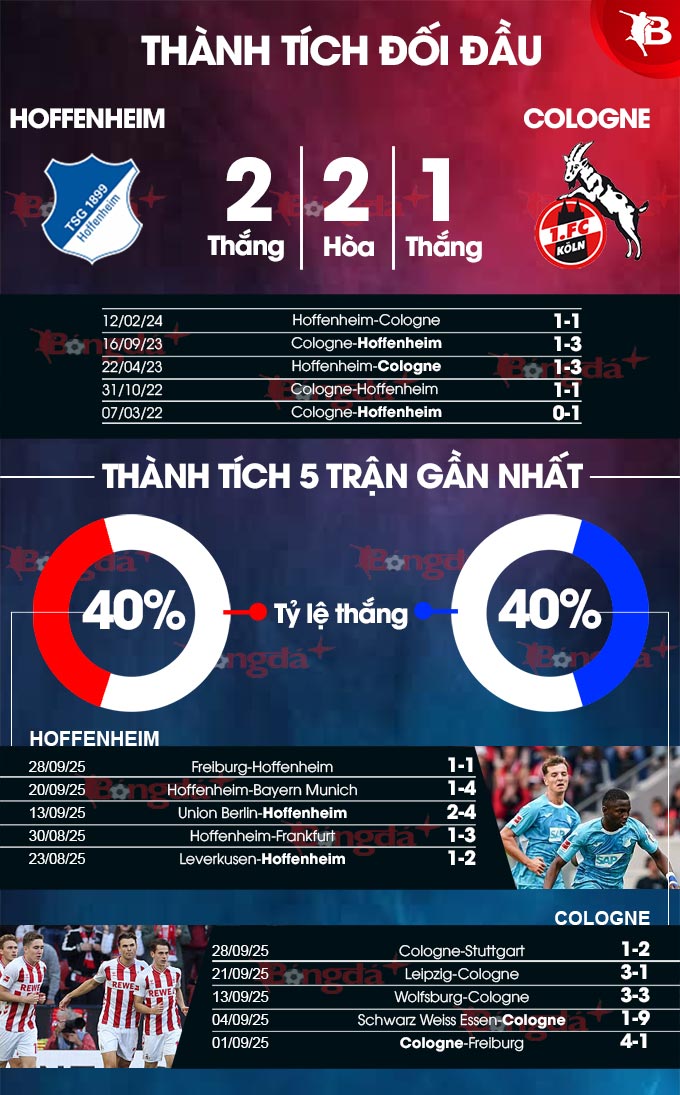 - Nhiều bàn thắng cả trận: 6/7 lần chạm trán giữa 2 đội gần đây trên sân của Hoffenheim đều có từ 3 bàn thắng trở lên. Tình trạng tương tự xảy ra ở 5/7 trận gần đây của Hoffenheim và 3/4 trận vừa qua của Cologne.