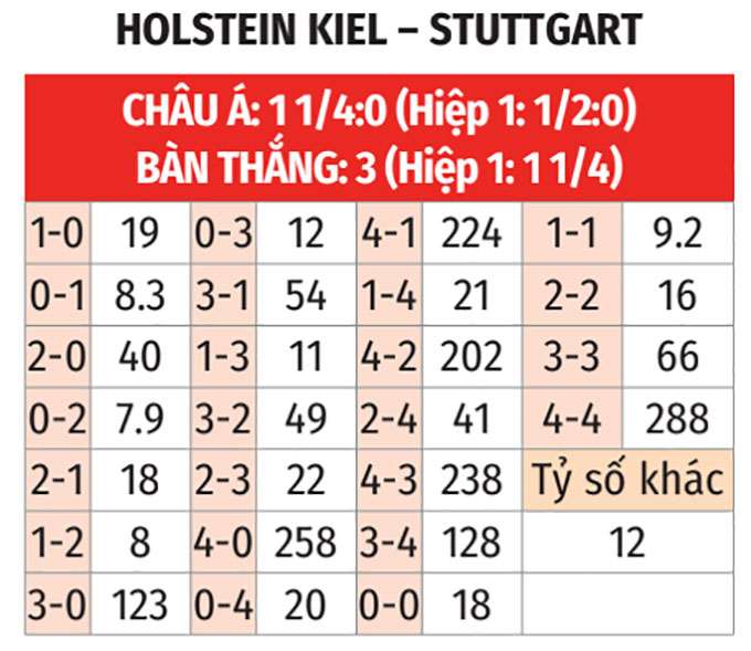 - Tối đa 1 bàn hiệp 1: 3/4 trận gần nhất giữa Holstein Kiel và Stuttgart chỉ có tối đa 1 bàn trong hiệp 1. 4/5 trận vừa qua của Holstein Kiel và 4/5 trận gần đây của Stuttgart cũng diễn ra theo kịch bản tương tự.