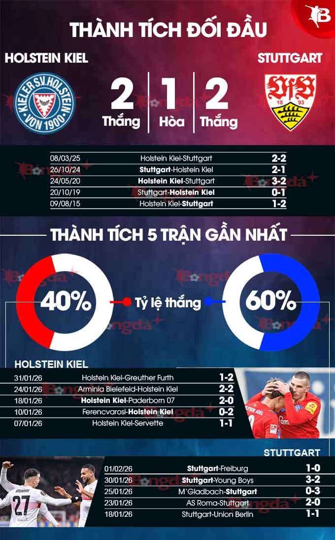 Với đà thắng như chẻ tre, Stuttgart đang có phong độ tốt hơn hẳn Holstein Kiel. Dù phải chơi trên sân khách, họ đủ khả năng khuất phục đối thủ đang không được góp mặt ở Bundesliga.