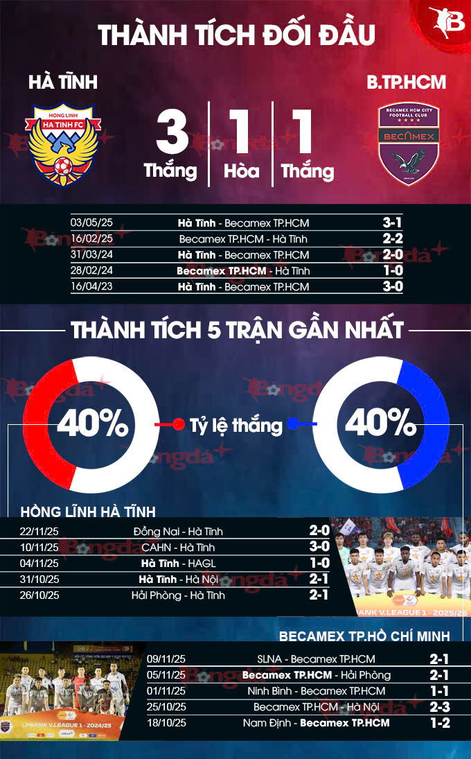 Trong 5 trận chính thức gần nhất, Hồng Lĩnh Hà Tĩnh không có phong độ cao bằng Becamex TP.HCM. Trong 2 lượt gần nhất, đội bóng miền Trung lần lượt thua Công an Hà Nội và Đồng Nai. Đây cũng chính là lý do mà HLV Nguyễn Công Mạnh sốt ruột tìm kiếm một tiền vệ trụ trong giai đoạn vừa rồi. Ở phía bên kia chiến tuyến, sự xuất hiện của HLV Đặng Trần Chỉnh đem đến bầu không khí tích cực. Becamex TP.HCM đánh bại Hải Phòng, cầm hoà Ninh Bình, vượt qua Nam Định và chỉ thua sát nút SLNA cùng Hà Nội.
