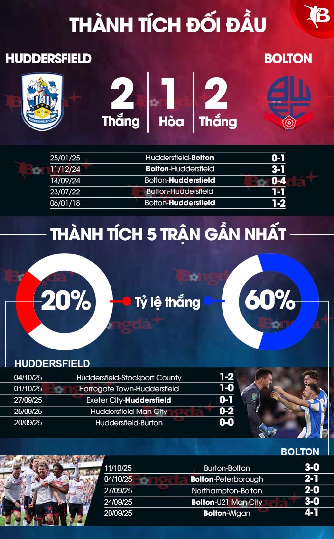 - Lưới rung 25 phút cuối: 2/3 trận chính thức gần đây giữa 2 CLB có bàn thắng từ phút 65 trở đi. Chưa hết, 4/7 trận vừa qua của Huddersfield và 2/3 trận vừa xong của Bolton cũng chung kịch bản.
