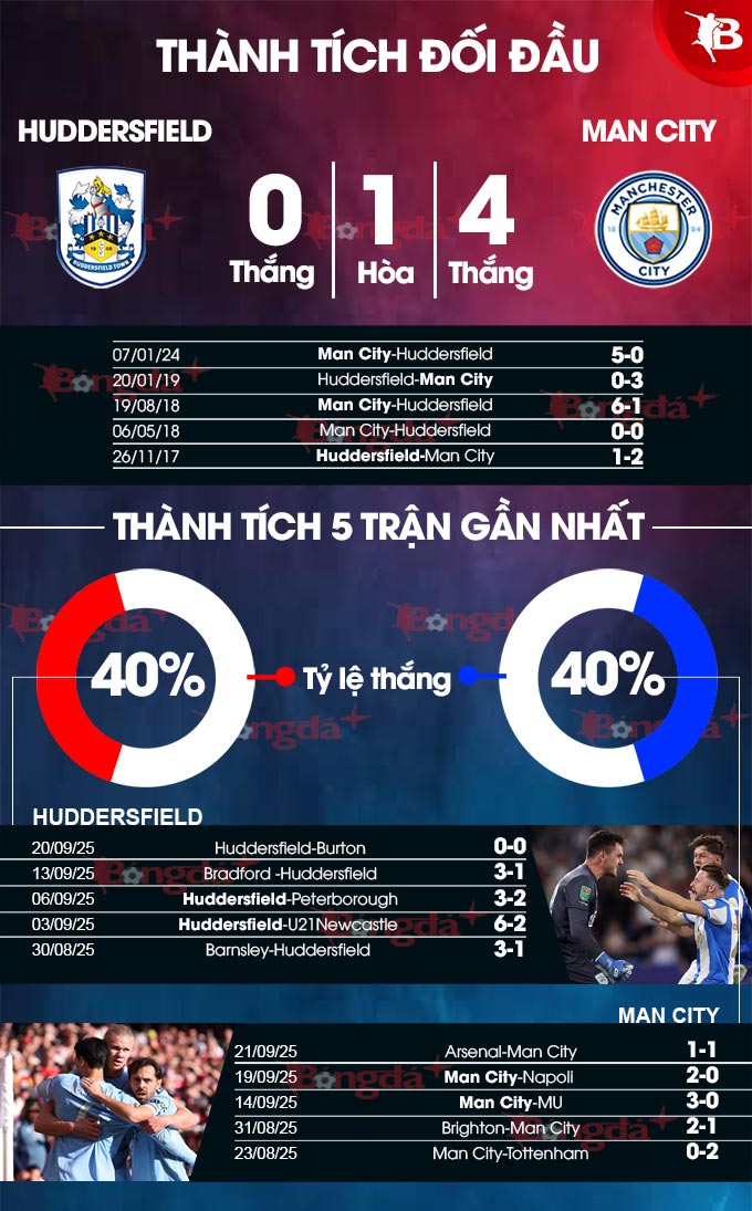 Ở 7 cuộc đụng độ giữa hai đội, Man City áp đảo hoàn toàn với 5 chiến thắng và 2 trận hòa. Chắc chắn họ muốn tiếp tục kéo dài chuỗi trận bất bại trước Huddersfield lên con số 8.