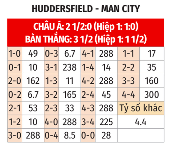 - Man City thắng theo châu Á: Man City thắng cả 3 cuộc chạm trán gần nhất, thắng 5/7 trận vừa qua, thắng 4/5 chuyến làm khách gần đây. Còn Huddersfield thua 3, hòa 1, chỉ thắng 1 ở 5 trận vừa qua. Do đó, giới mộ điệu có thể tin tưởng vào Man City ở trận này.