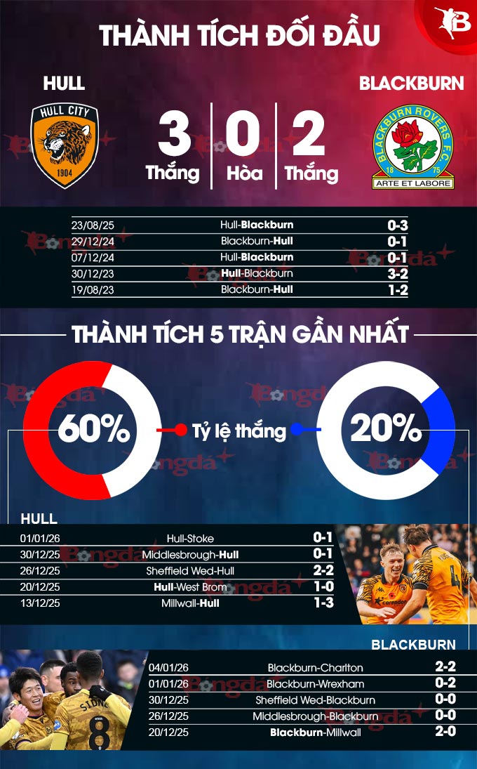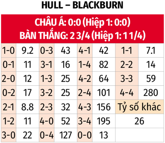 - Ít bàn thắng: 3/4 trận gần đây của Hull City kết thúc với tỷ số tối thiểu. Với Blackburn, 4/5 trận vừa qua của đội khách có tối đa 2 bàn thắng được ghi. Kịch bản tương tự cũng diễn ra ở 6/9 trận đối đầu gần nhất.