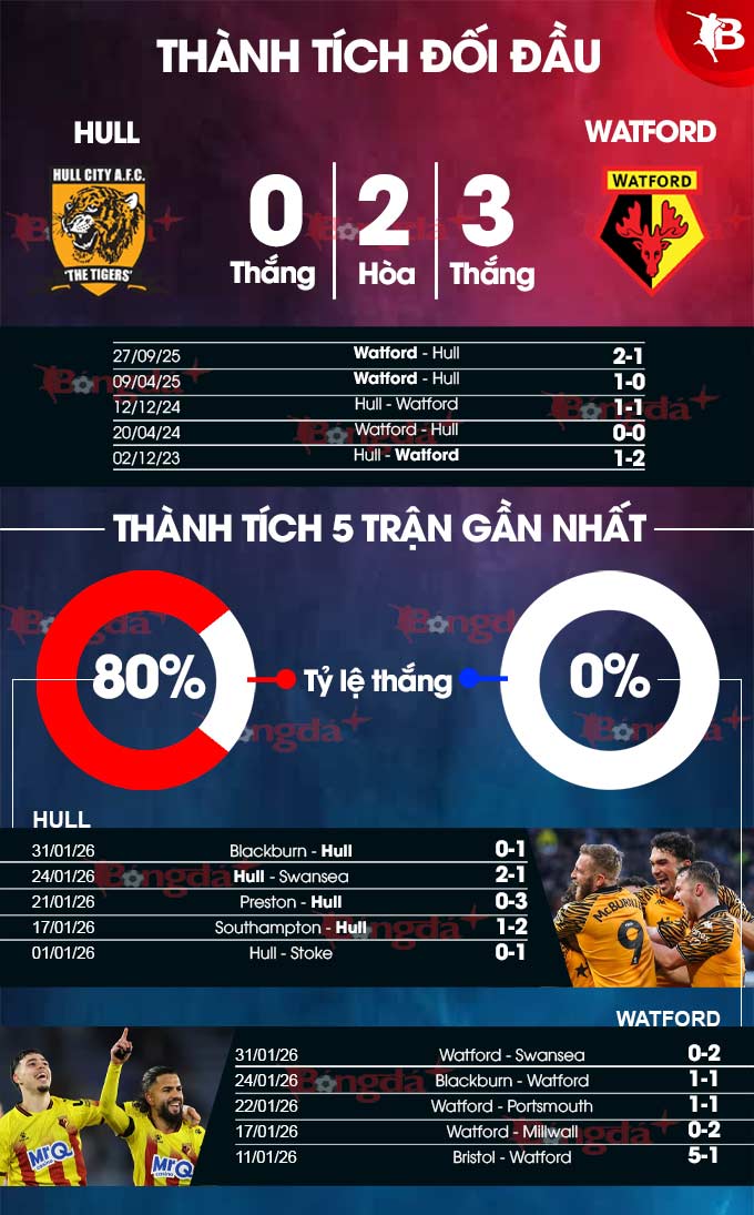 Thành tích đối đầu của hai đội hiện khá cân bằng với 8 chiến thắng cho mỗi bên và 6 trận hòa sau 22 lần đụng độ gần đây. Và với lợi thế sân nhà, Hull rất quyết tâm giành chiến thắng đầu tiên tiên trước đối thủ khó chịu Watford, sau 5 lần không thắng gần nhất (3 thua, 2 hòa).