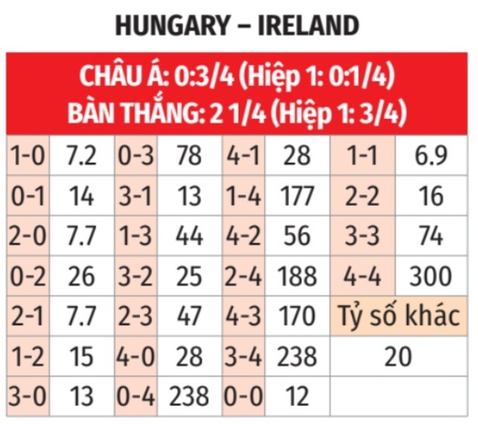 - Tối đa 4 góc hiệp 1: 4/5 trận gần đây của Hungary đều chỉ xuất hiện tối đa 4 quả phạt góc trong hiệp 1. 3/4 trận sân khách vừa qua của Ireland cũng chỉ có 4 quả phạt góc đổ lại trong hiệp đầu.