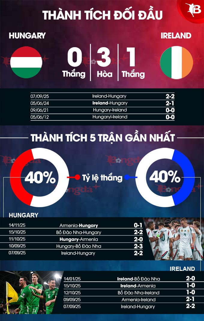 - Tối thiểu 3 bàn cả trận: 2 lần đối đầu giữa 2 đội gần đây đều có từ 3 bàn thắng trở lên. 5/7 trận gần đây của Hungary và 3/4 trận chính thức trên sân khách vừa qua của Ireland xảy ra tình trạng tương tự.