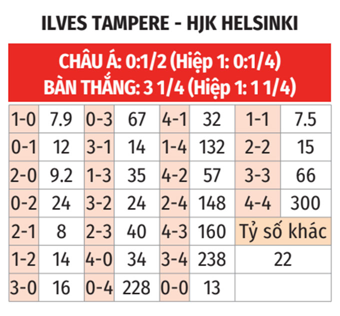 - Tối thiểu 4 bàn: 4/5 trận gần đây của HJK Helsinki đều có tối thiểu 4 bàn. 3 trận gần nhất giữa đội bóng này và Ilves Tampere số lần lưới rung cũng không dưới 4.