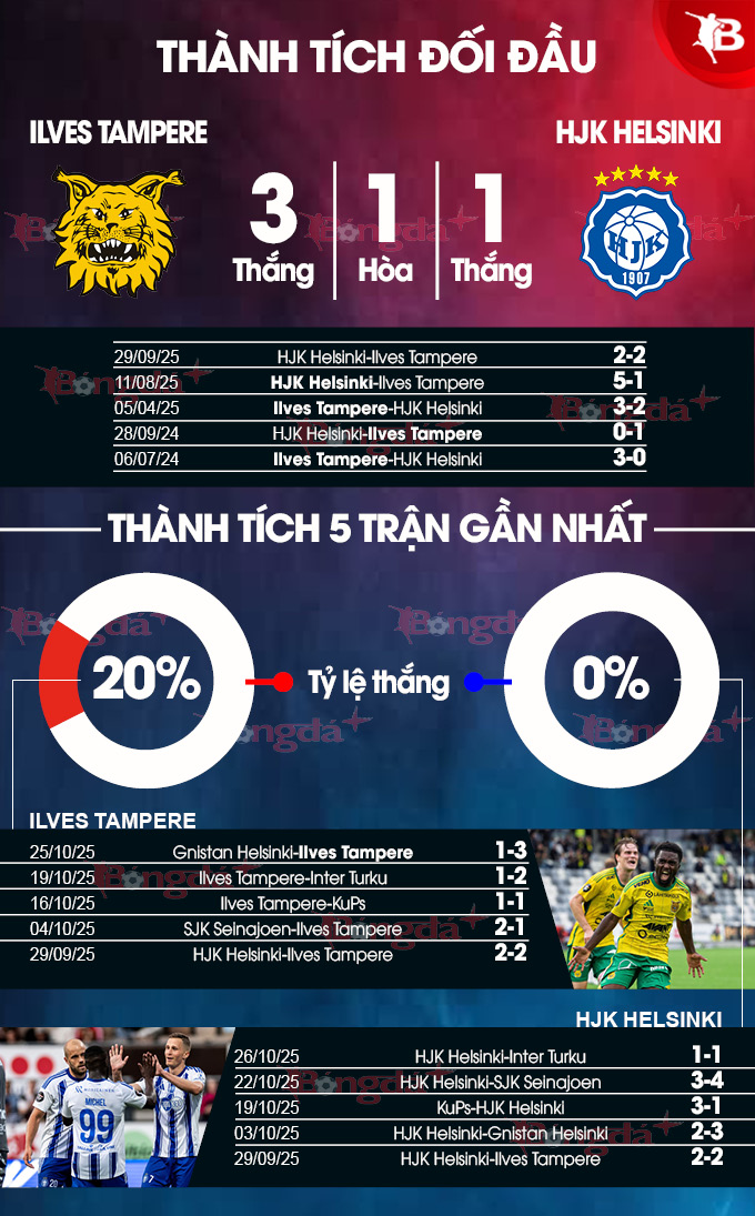 - Lưới rung cuối trận: Cả 4 trận gần đây của Ilves Tampere đều có bàn thắng được ghi trong 10 phút cuối. 3/4 trận vừa qua của HJK Helsinki bảng tỷ số còn cập nhật từ phút 90 trở đi.