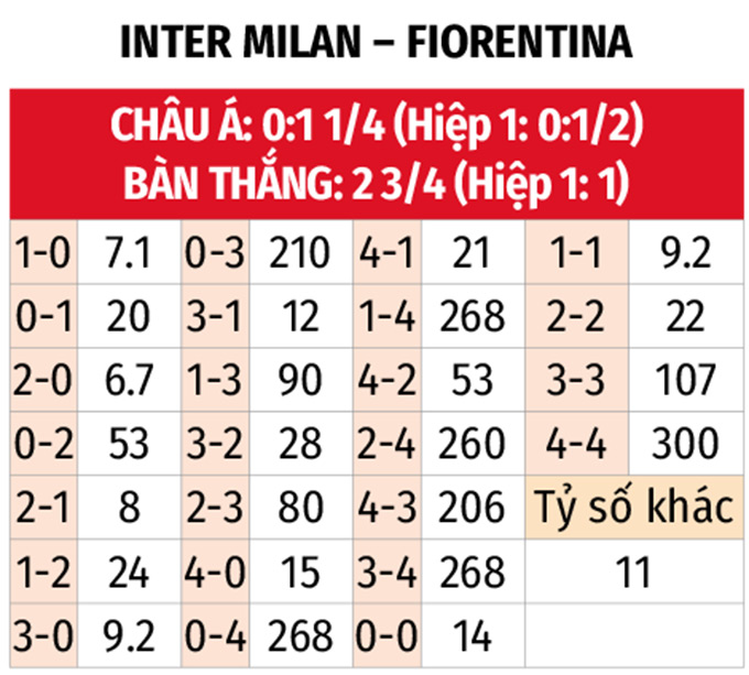 - Tối đa 4 góc hiệp 1: Các trận đấu có sự xuất hiện của Inter Milan thời gian gần đây thường xuyên trong tình trạng "câm góc" hiệp đầu, khi 7/9 trận trên mọi đấu trường có tối đa 4 tình huống đá phạt góc. Với Fiorentina, 7/9 trận sân khách vừa qua của đội bóng này cũng xuất hiện nhiều nhất 4 quả đá phạt góc trong 45 phút đầu tiên. Chưa kể, 2/3 trận đối đầu gần nhất trên sân Giuseppe Meazza cũng có không quá 4 lần bóng được đặt ở bốn cột góc cuối sân trước giờ nghỉ.
